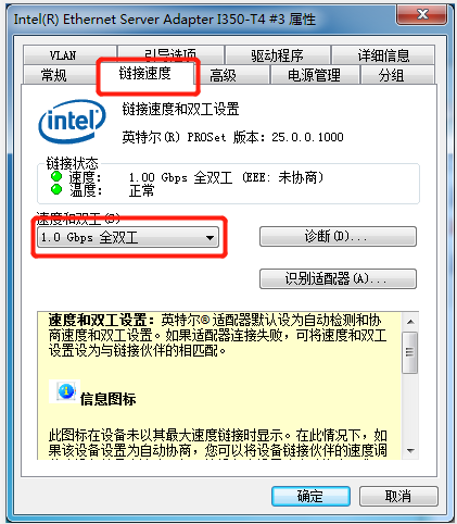 →将“链接速度”选项卡中的“速度和双工”属性,修改为“1.0 Gbps全双工”