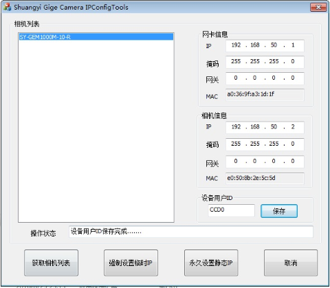 5) 填写相机IP地址(默认192.168.50.2为CCD0,192.168.51.2为CCD1,以此类推),点击强制设置临时IP,系统会显示强制设置临时IP完成……