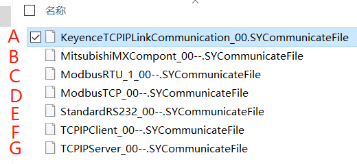 在软件的根目录下“SYCommunicateFile”中生成的通讯文档,如下图所示:(注释:文档名称标准格式为 XX_00.SYCommunicateFile,如下图 A 文档符合名称定义,因此系统加载此通信方式)