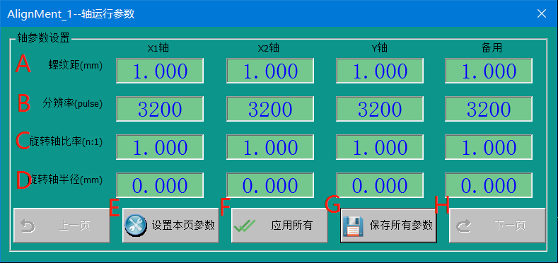 A. 螺纹距:每个轴对应丝杆的螺纹距,即丝杆旋转一圈前进的距离;
