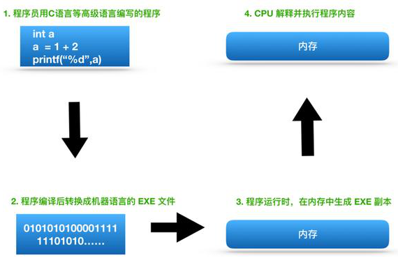 在这个流程中,CPU 负责的就是解释和运行最终转换成机器语言的内容。
