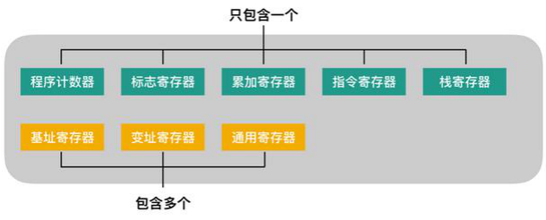 其中程序计数器、累加寄存器、标志寄存器、指令寄存器和栈寄存器都只有一个,其他寄存器一般有多个。