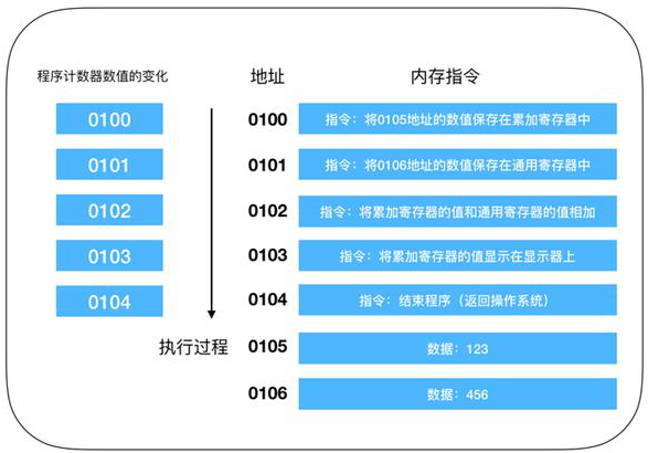 这是一段进行相加的操作,程序启动,在经过编译解析后会由操作系统把硬盘中的程序复制到内存中,示例中的程序是将 123 和 456 执行相加操作,并将结果输出到显示器上。由于使用机器语言难以描述,所以这是经过翻译后的结果,实际上每个指令和数据都可能分布在不同的地址上,但为了方便说明,把组成一条指令的内存和数据放在了一个内存地址上。