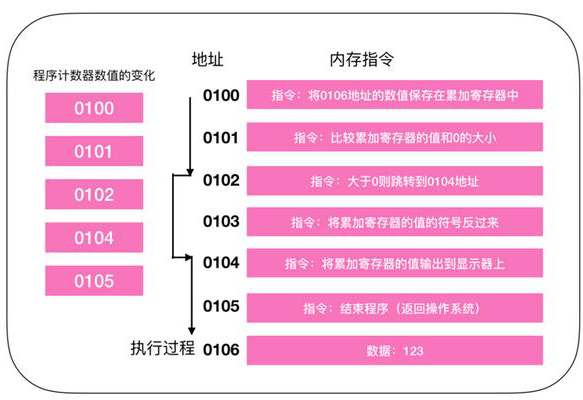 地址 0100 是程序运行的起始位置。Windows 等操作系统把程序从硬盘复制到内存后,会将程序计数器作为设定为起始位置 0100,然后执行程序,每执行一条指令后,程序计数器的数值会增加1(或者直接指向下一条指令的地址),然后,CPU 就会根据程序计数器的数值,从内存中读取命令并执行,也就是说,程序计数器控制着程序的流程。