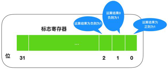 CPU 在进行运算时,标志寄存器的数值会根据当前运算的结果自动设定,运算结果的正、负和零三种状态由标志寄存器的三个位表示。标志寄存器的第一个字节位、第二个字节位、第三个字节位各自的结果都为1时,分别代表着正数、零和负数。