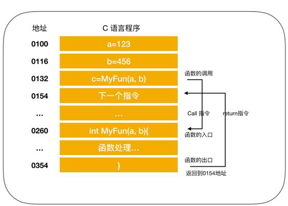 图中将变量 a 和 b 分别赋值为 123 和 456 ,调用 MyFun(a,b) 方法,进行指令跳转。图中的地址是将 C 语言编译成机器语言后运行时的地址,由于1行 C 程序在编译后通常会变为多行机器语言,所以图中的地址是分散的。在执行完 MyFun(a,b)指令后,程序会返回到 MyFun(a,b) 的下一条指令,CPU 继续执行下面的指令。
