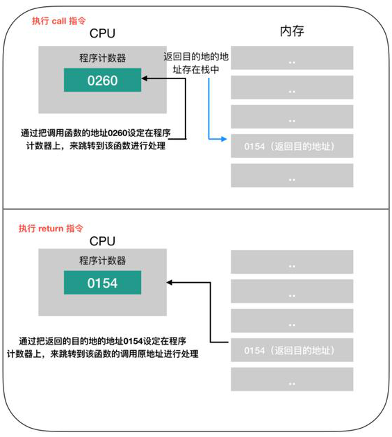 在一些高级语言的条件或者循环语句中,函数调用的处理会转换成 call 指令,函数结束后的处理则会转换成 return 指令。