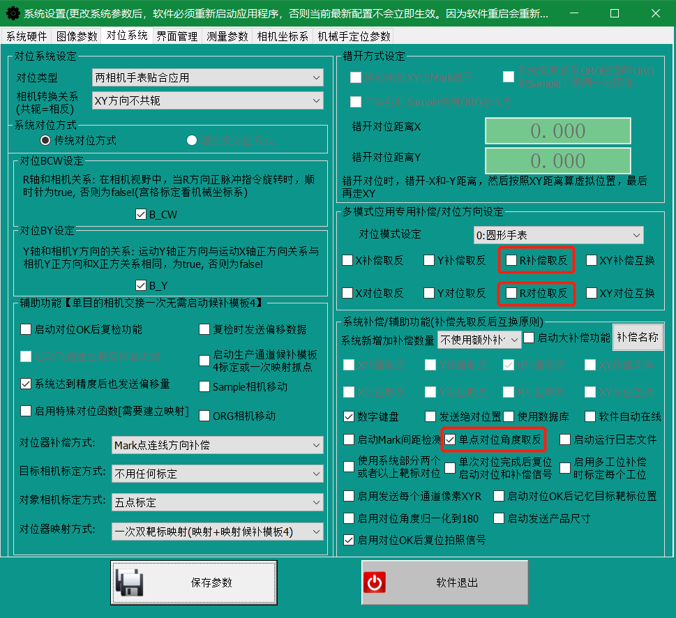 ? 单点对位角度取反:当对位角度收敛趋势正确时,根据对位后XY方向是否出现明显偏差来进行勾选,勾选时需要与“对位R取反”配合使用。(即初始如果单点对位角度取反为true,对位R取反为false。如果修改了单点对位角度取反为false,那么对位R取反同步也要改为true)