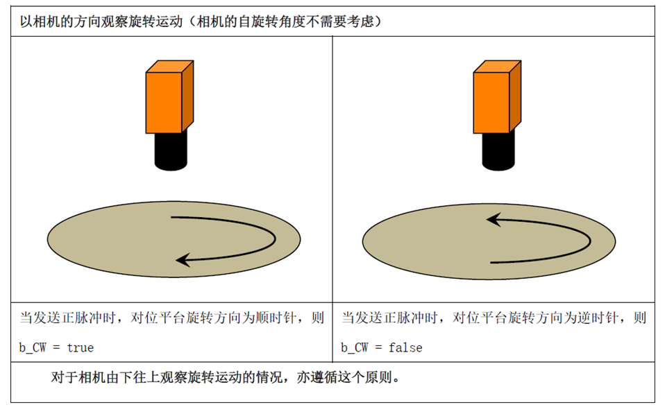 在相机视野中(相机坐标系是常规的向右X+,向下Y+),当R方向正脉冲指令旋转时,顺时针为true,否则为false!