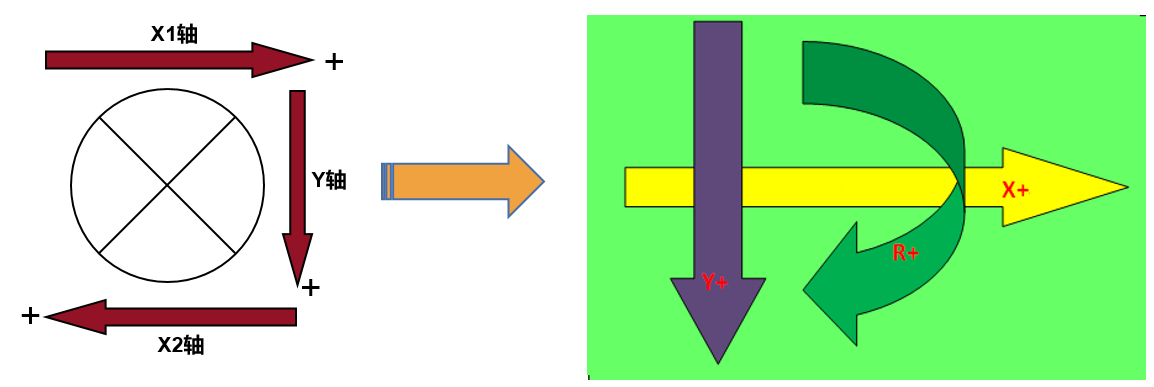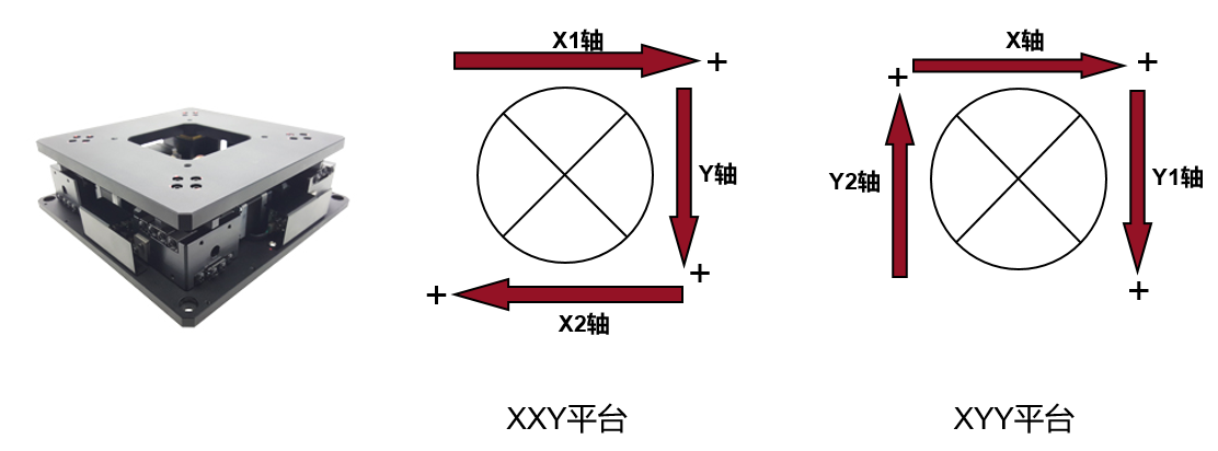XXY平台的X方向运动,由X1和X2轴同时运动相同距离形成,Y方向运动由Y轴独立运动形成,旋转运动由3轴同时正向或者负向运动相等距离形成;