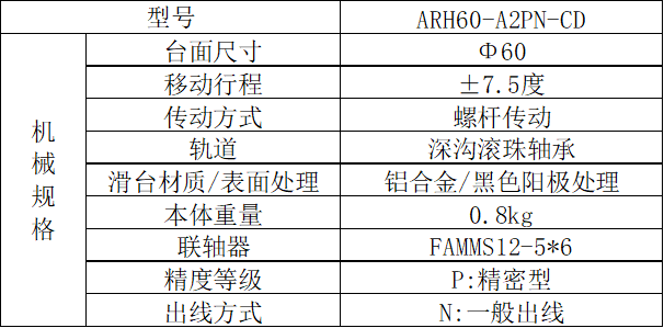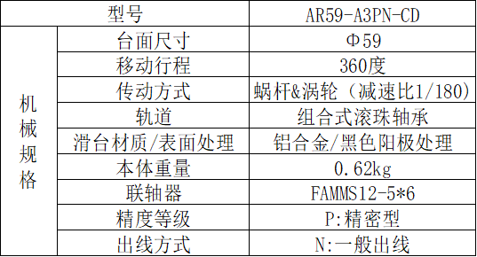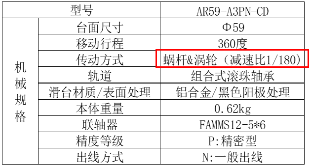 我们选用的旋转平台为AR59-A3PN-CD,其蜗杆/涡轮减速比为1/180,表示蜗杆转1圈,涡轮转1/180圈。如我们选用的电机分辨率为3200Pulse/Rev,那么涡轮转动一圈需要180*3200Pulse=576000Pulse/Rev。该旋转机构角度分辨率则为360度/576000=0.000625度/脉冲