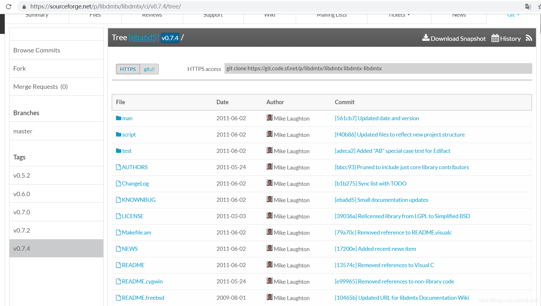 1、在该链接https://sourceforge.net/p/libdmtx/libdmtx/ci/v0.7.4/tree/将0.7.4和0.7.2两个版本的库下载至本机,并解压。