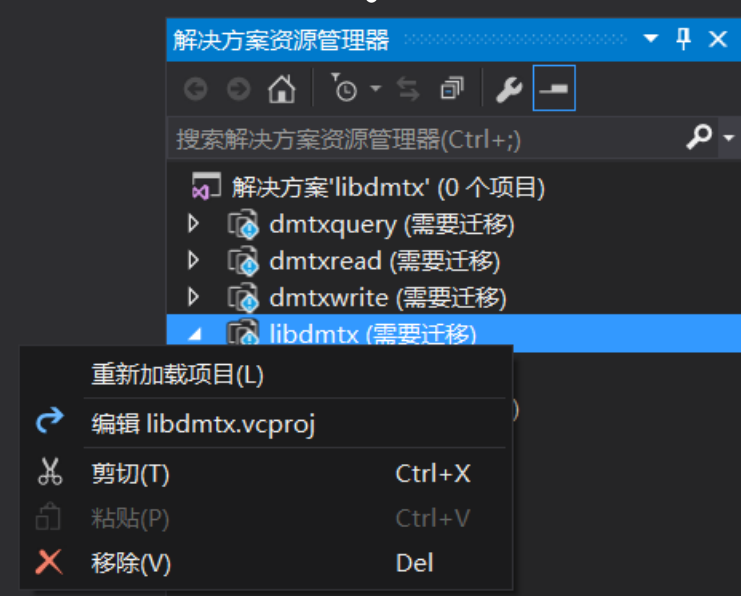 4、选中解决方案libdmtx,右键重新加载项目,确定单向升级。
