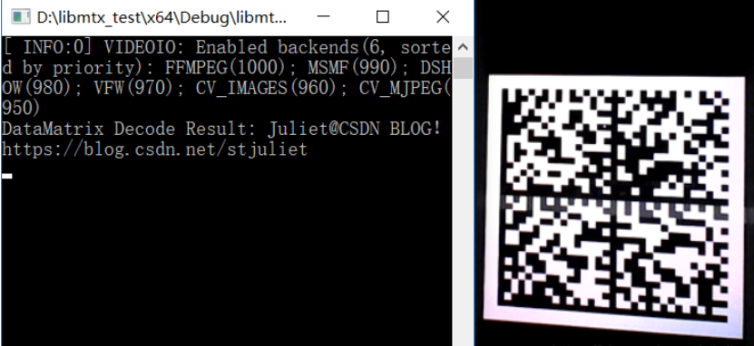 实际测试中,选择使用摄像头捕获用代码生成的DM码,解码结果为CSDN博客网址。