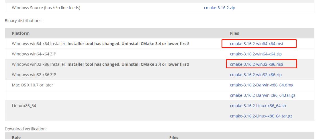 1)下载cmake : https://cmake.org/download/ 在这我选择可以直接在windows安装的文件,如我这下载的是 cmake-3.16.2-win32-x86.msi。可以根据自己的系统来选择32位或者64位。