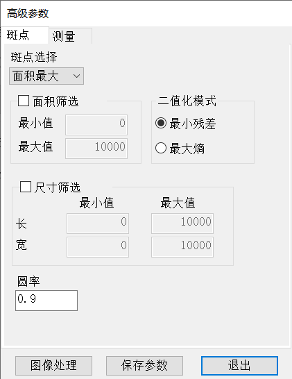 斑点分析的前提是把斑点与背景分割开来。一般情况下,默认使用【最小残差】即可处理绝大部分的图像。当图像明暗不明显,或斑点与背景对比不明显时,使用【最小残差】的效果将受到影响,这时使用【最大熵】会得到较理想的效果。
