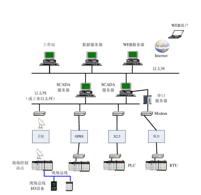 通信网络实现SCADA系统的数据通信,是SCADA系统的重要组成部分。与一般的过程监控相比,通信网络在SCADA系统中分演的作用更为重要,这主要因为SCADA系统监控的过程大多具有地理分散的特点,如无线通信机站系统的监控。