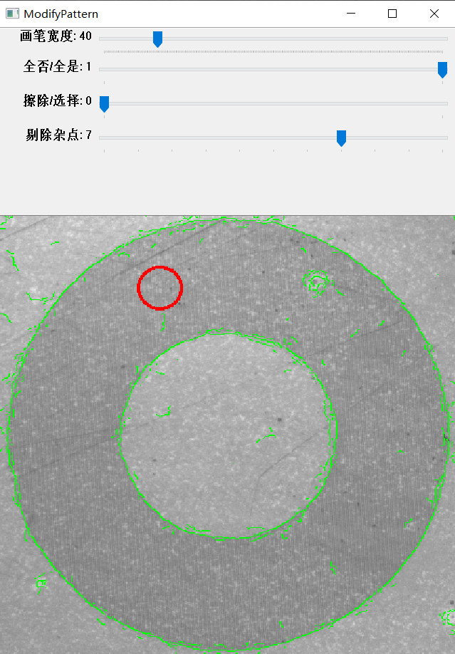 如模板存在干扰的边缘特征点,可以对模板轮廓进行修改优化,从而改善轮廓匹配搜索目标的性能。算法在提取边缘特征点时,将不再考虑被涂的红色区域内的特征点。