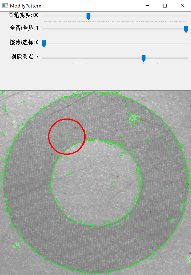 如模板存在干扰的边缘特征点,可以对模板轮廓进行修改优化,从而改善轮廓匹配搜索目标的性能。算法在提取边缘特征点时,将不再考虑被涂的红色区域内的特征点。