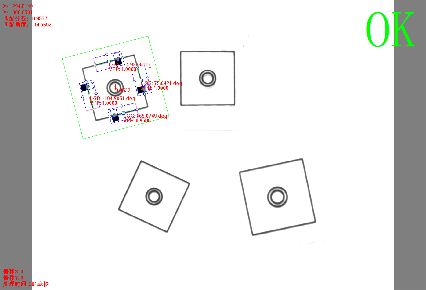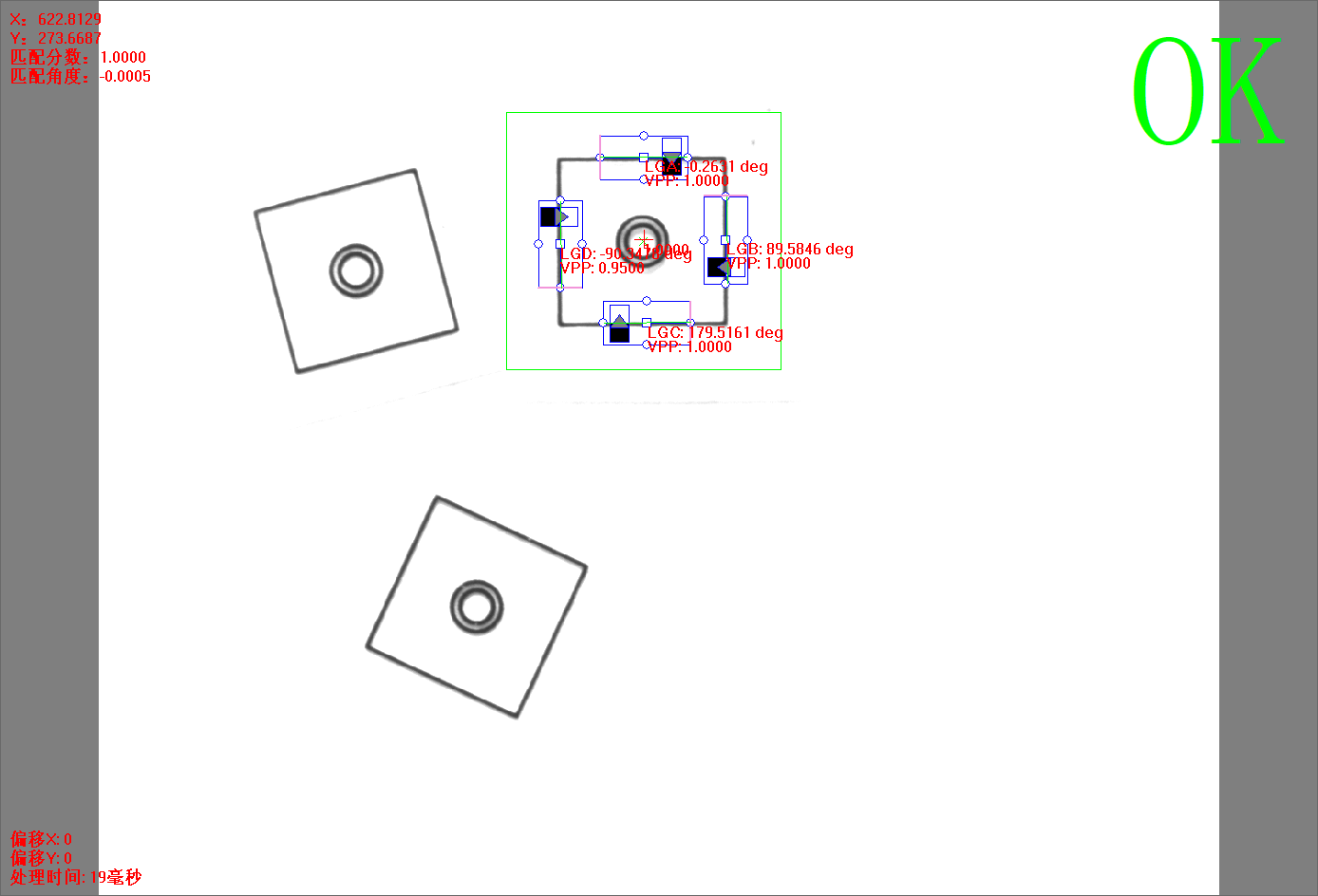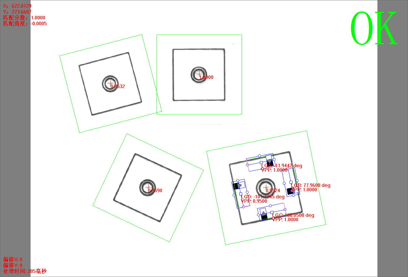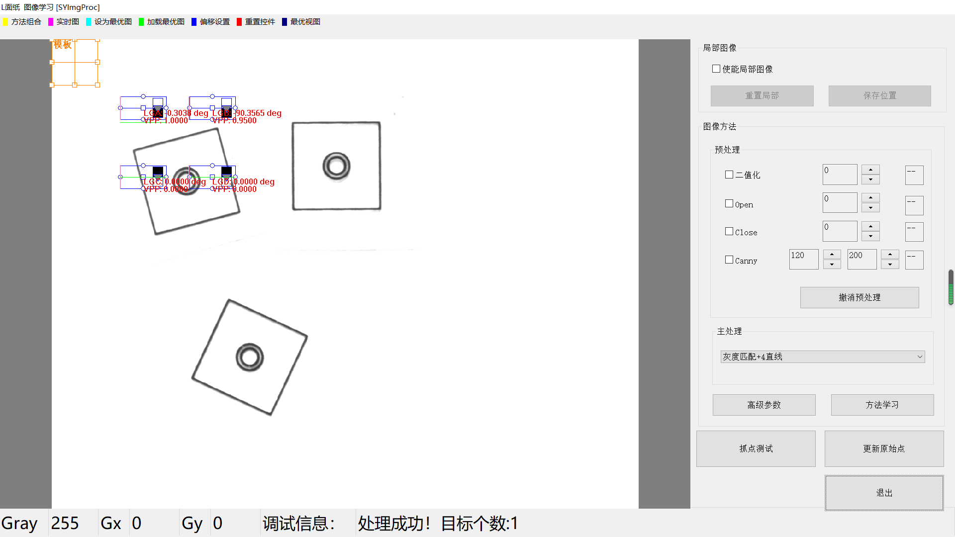 点击【方法学习】后,灰度匹配+4直线方法的所有信息将被保存,并自动进行图像处理,相关的信息将显示。