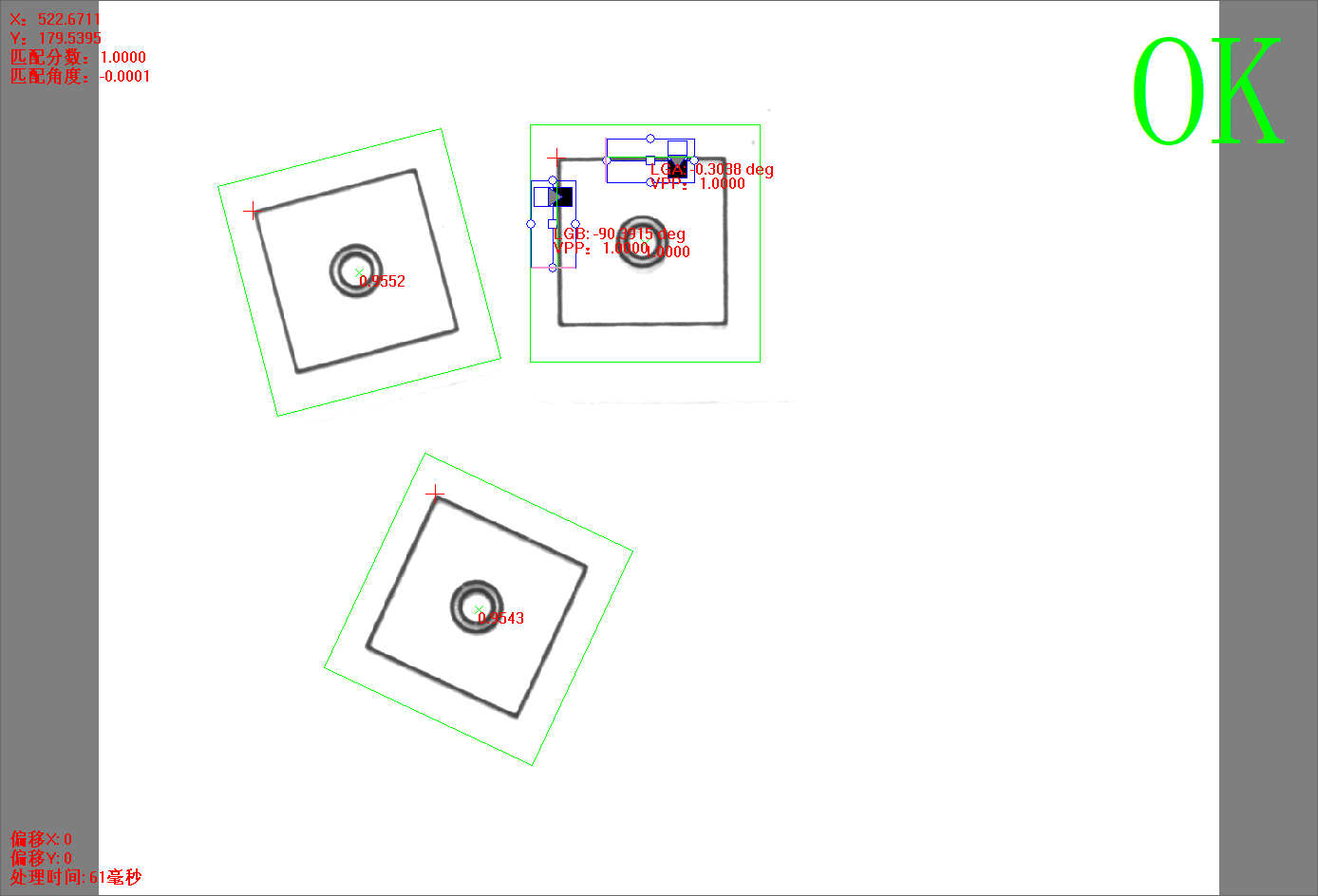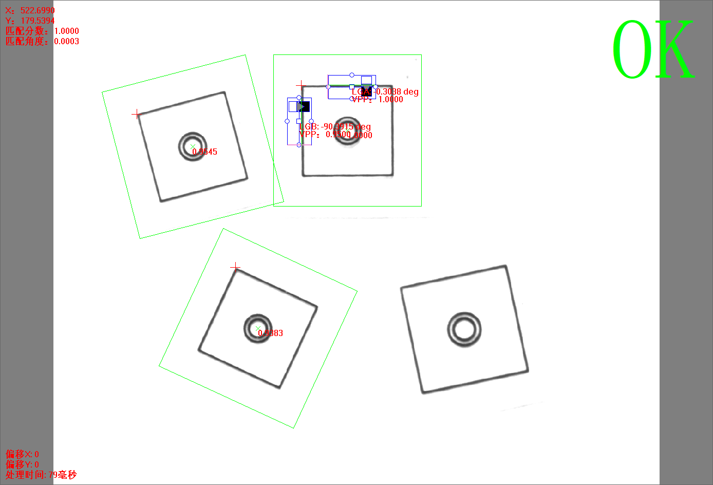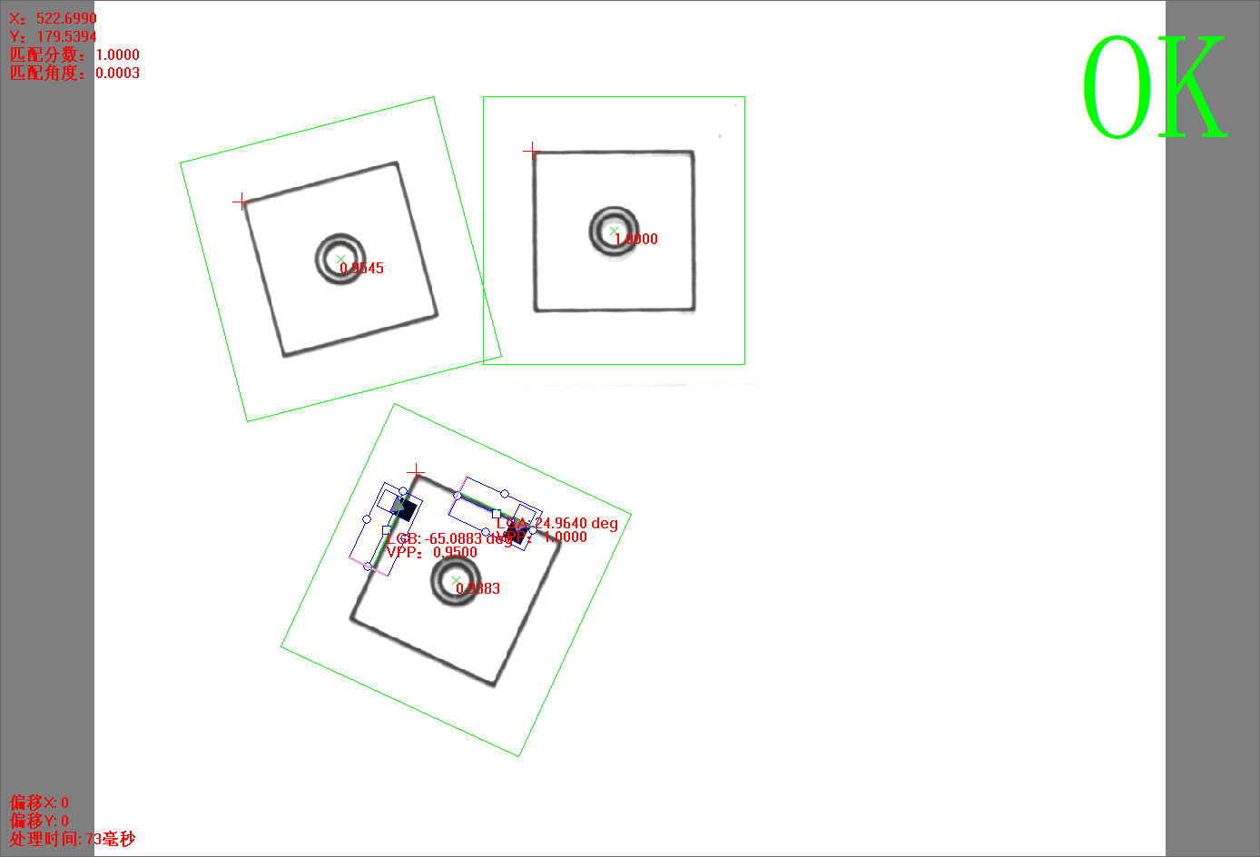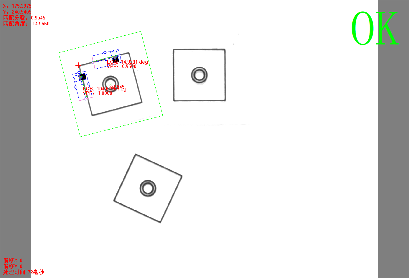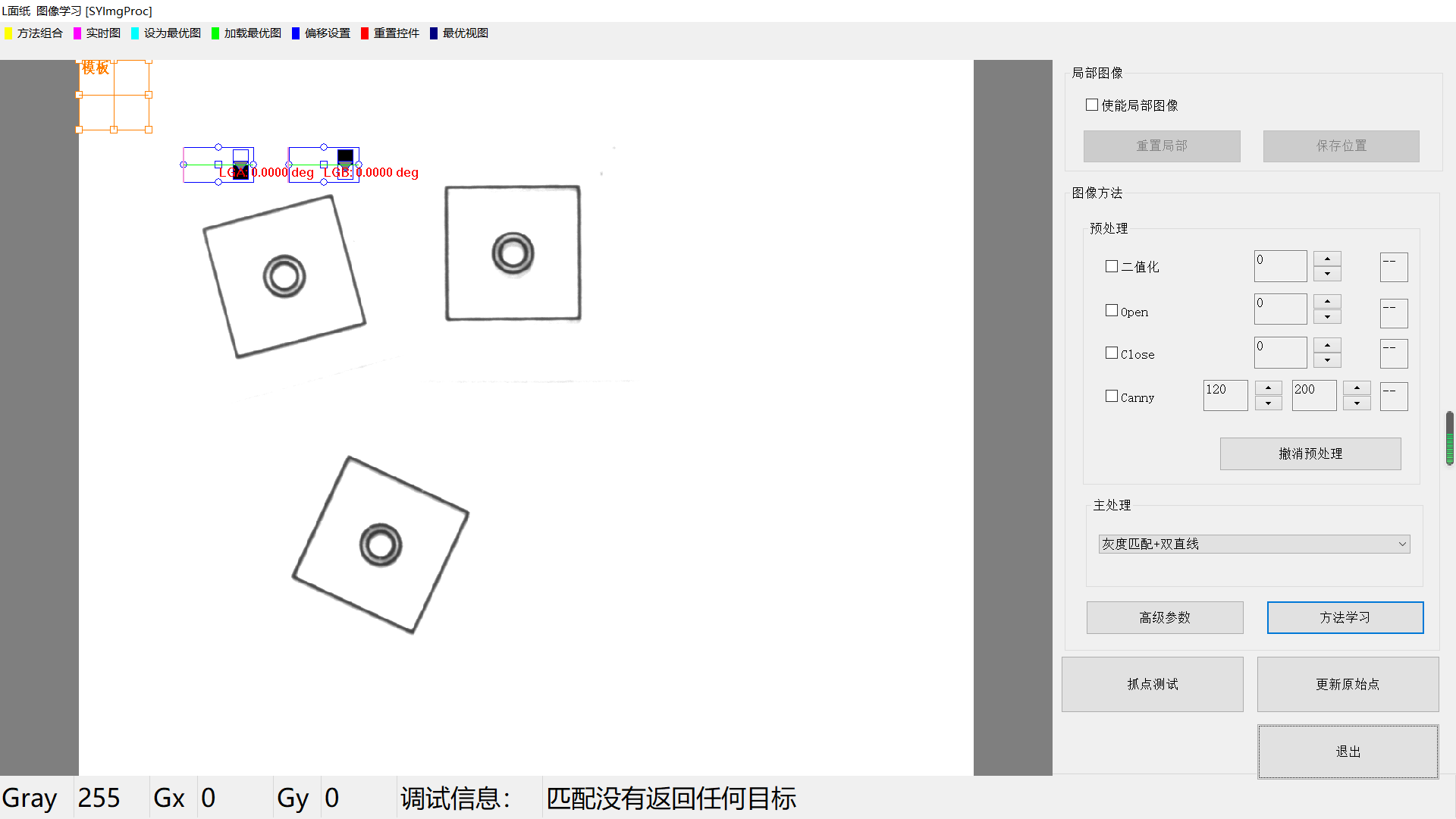 点击【方法学习】后,灰度匹配+双直线方法的所有信息将被保存,并自动进行图像处理,相关的信息将显示。
