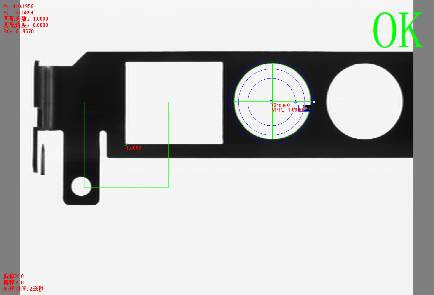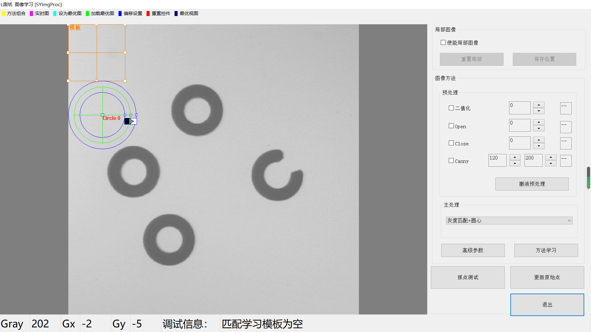 点击【方法学习】后,灰度匹配+圆心 方法的所有信息将被保存,并自动进行图像处理,相关的信息将显示。