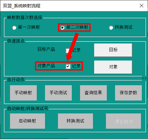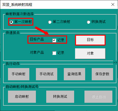 1) 系统全体停止,将TP搬运到目标相机下,打开映射界面,勾选第一次映射,再勾选目标产品“记录”,点击“目标”按钮,系统会抓取Mark点的坐标。