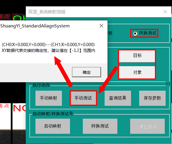 6) 勾选转换测试,再做第三次交接,步骤同上,抓点OK后点击手动测试。CH数据需要在【-3~3】范围内才算映射合格。代表产品交接稳定,否则需要检查抓点问题和机构交接的稳定性问题。