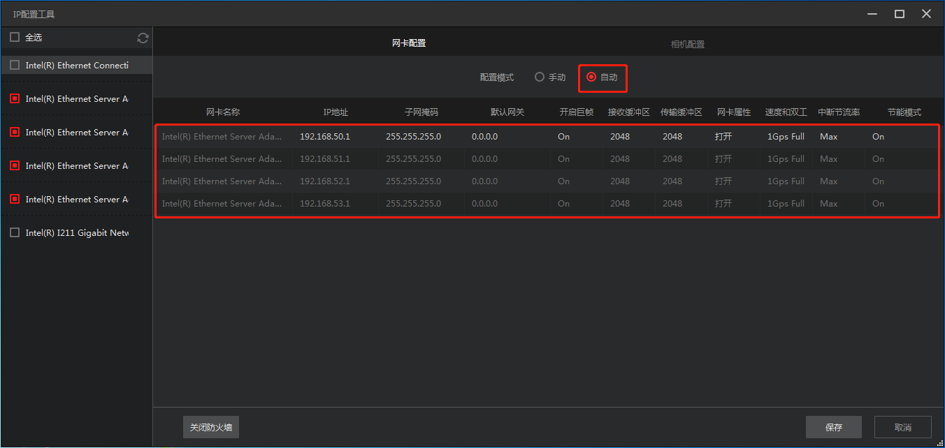 7. 也可以像配置网卡一样,配置好第一个相机后点击配置模式中的自动,让工具自动配置剩余相机的IP;