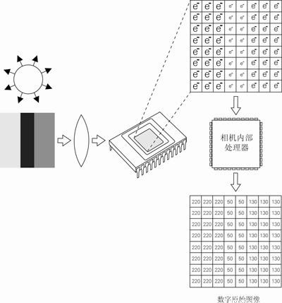 如图所示,物体在有光线照射到它时将会产生反射,这些反射光线进入镜头光圈照射在 CCD 芯片上,在各个单元中生成电子。