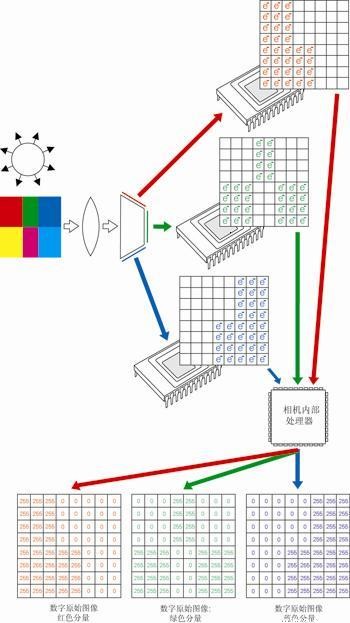 在这种情况下,如果我们希望使用 CCD 作为相机感光芯片,并输出红、绿、蓝三色分量,就可以采用一个分光棱镜和三个 CCD,如图所示。棱镜将光线中的红、绿、蓝三个基本色分开,使其分别投射在一个 CCD 上。这样以来,每个 CCD 就只对一种基本色分量感光。
