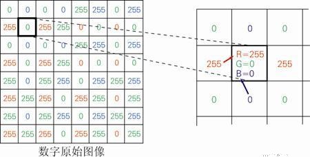 以上图中左下角的红色区域为例,我们需要的是丢失了的绿色与蓝色的值。而插值法可以通过分析与这个红色像素相邻的像素计算出这两个值。在这个例子中,算法发现该区域像素绿色像素均含有大量电荷,但蓝色像素电荷数为零,所以可以计算出,这个红色像素实际上是黄色的。