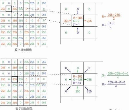 但针对图中第二个示例像素点的计算指出了均值法的一个重大缺陷:均值法有低通特性,并由此将清晰的边界钝化。如该点 RGB 值本应是(255,0,0),但计算后变成了(255,128,64),即由红色变成了棕橙色。