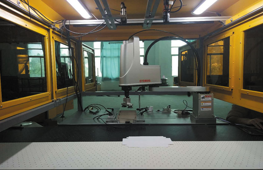 光电传感器检测目标到位,皮带停止传送,根据外部信号触发拍照获取当前目标的图像信息,“杏耀平台登录入口MasterAlign纸盒自动贴合系统”通过分析将图像和机械手坐标进行关系统一,然后将目标位置传给机械手系统运动定位,进而实现静态贴合。