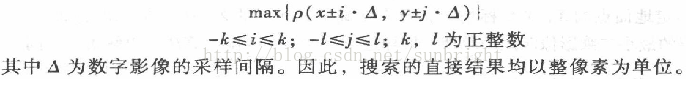 注意:这里没有引入几何变形参数,因此,匹配算法采用目标区相对于搜索区不断移动一个整体像素,在移动的过程中计算相关系数,搜索最大相关系数的影像区作为同名像点。
