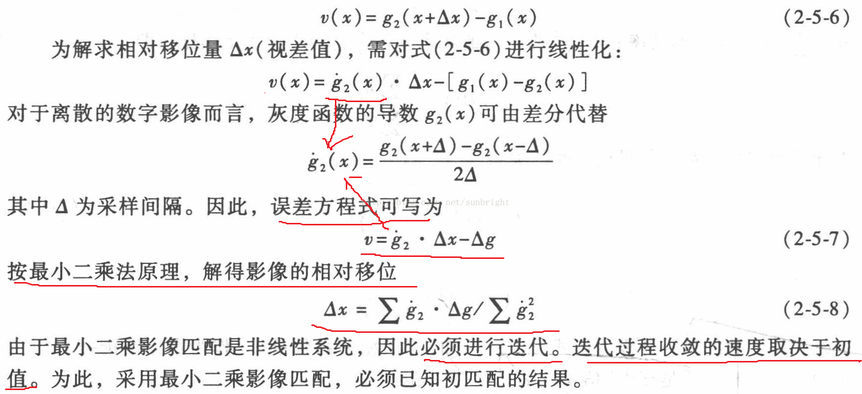 • 一般的影像匹配只考虑影像灰度的偶然误差v=g1(x,y)-g2(x,y);而LSM在此基础上,还引入了系统变形参数,同时按照最小二乘的原则,解求这些参数。