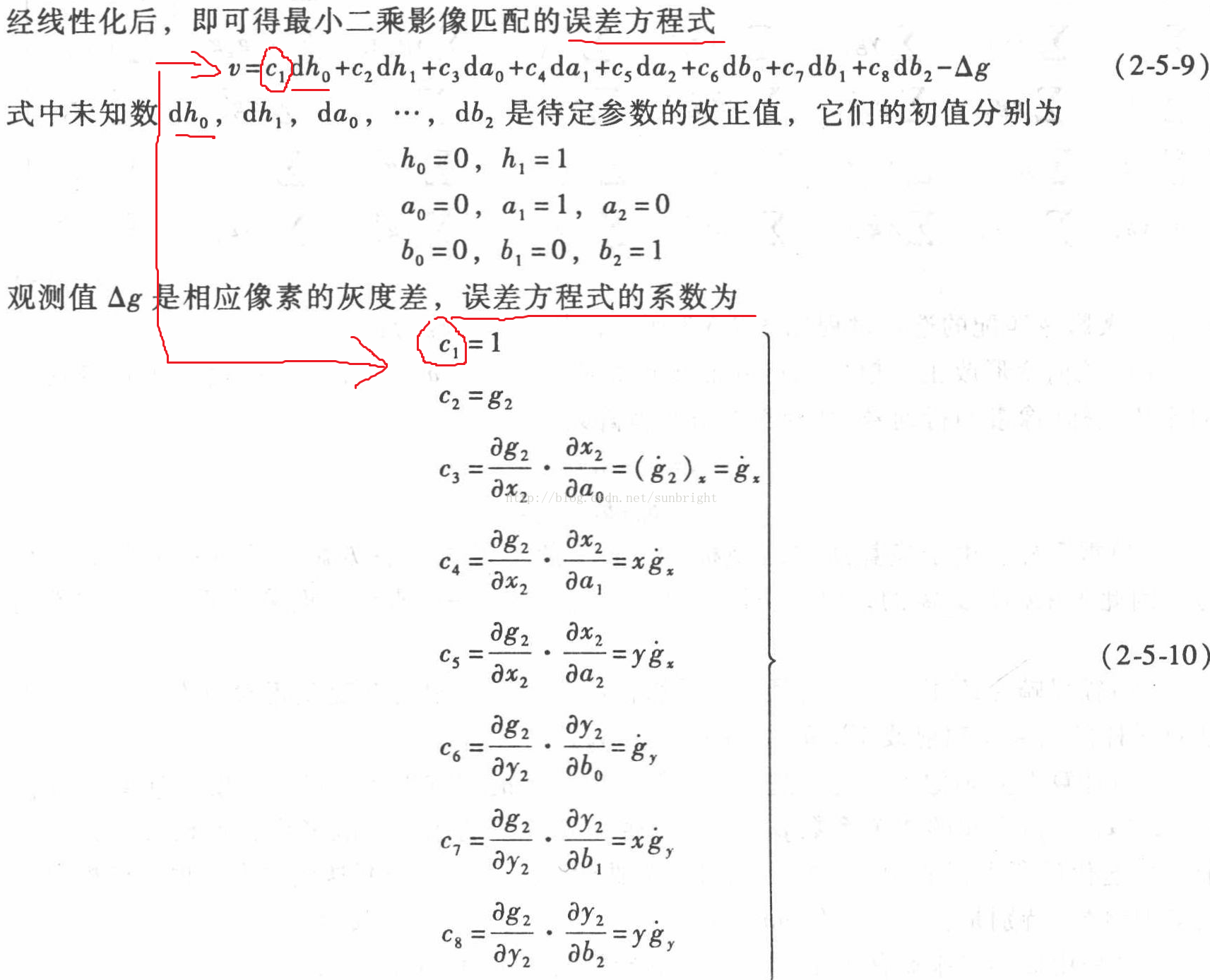 • 以灰度差平方和最小为判据(灰度差v),则影像匹配方程式为