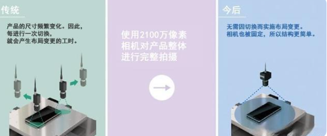 2.同一生产线上会生产多种产品,存在切换的麻烦。所用的相机分辨率较低时,要实现目标精度,就必须将拍摄视野变窄。所以,在同一生产线上实施多项生产时,每进行一次切换,会同时产生相机布局变更的工时。但只要用2100万像素相机对产品整体进行完整拍摄,就能免除切换的工时,可固定使用相机,能够构建起简单的生产系统。此外,可以统一进行多种产品的检测。