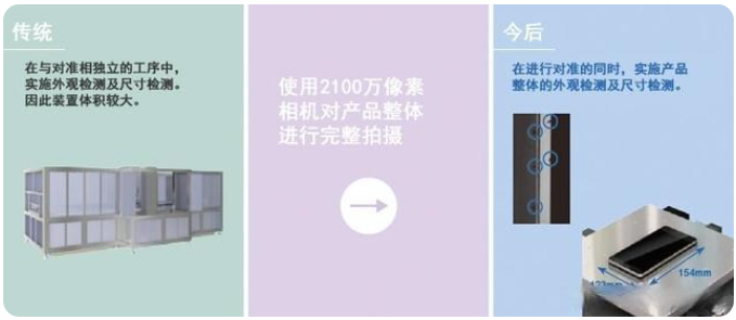 3.在与对准相独立的工序中,实施利用视觉系统的外观/尺寸检测 。除了对准,在其他独立工序中实施外观检测及尺寸检测的案例还有很多,只要用2100万像素相机对产品整体进行完整拍摄,就能同时进行对准和产品的整体外观检测。最终有助于减小生产设备的体积。