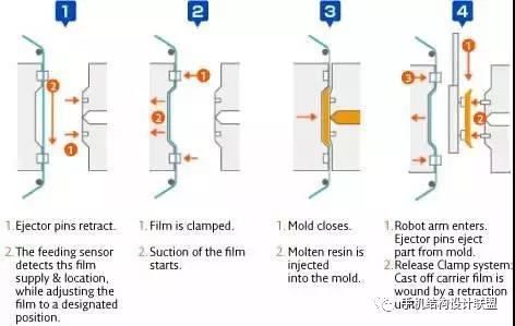 在进行IMD 生产时,转印箔定位于动模模腔中,然后注塑,离型层会汽化,使载体和颜色层分离,此时颜色层通过热熔胶与注塑件结合。注意:进行IMD 生产时,模具的顶杆是设计在定模上,即注塑完成后,塑件留在定模上,由顶杆推出。