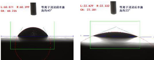 下图5显示一种塑胶材料等离子清洁后水滴角从约60°的变为约22°,活性增强。