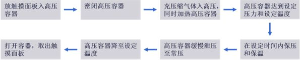 触控膜放置在高压、较高温度的环境下,可以挤出膜片内的气体,以达到脱泡的目的。一般触摸面板贴合后的气泡小于2mm,再经过脱泡机脱泡处理后,气泡都可以消除;过大的气泡需要先采用单点脱泡。脱泡过程如图6所示。