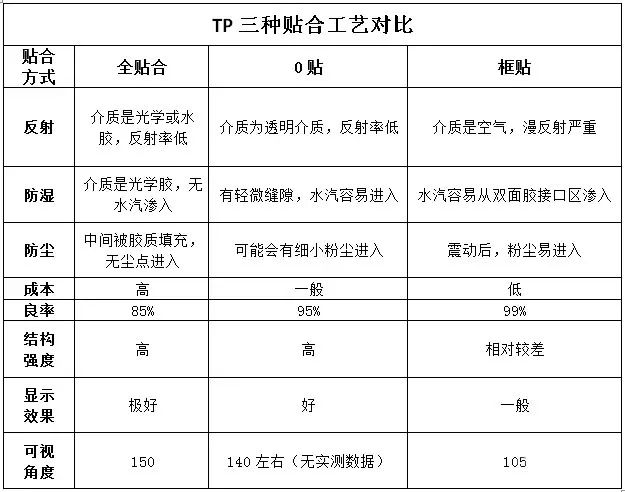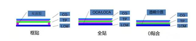 触控屏按贴合的方式可以分为全贴合和0贴合、框贴三种: