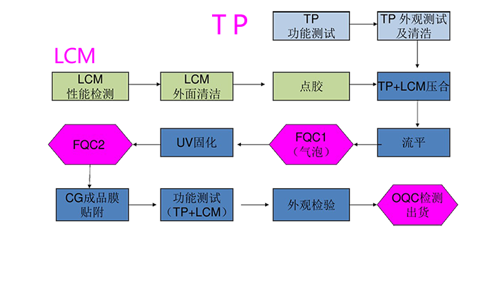 从屏幕的结构上看,我们可以把屏幕大致分成三部分,从上到下分别是保护玻璃,TP、显示屏。而这三部分是需要进行贴合的。