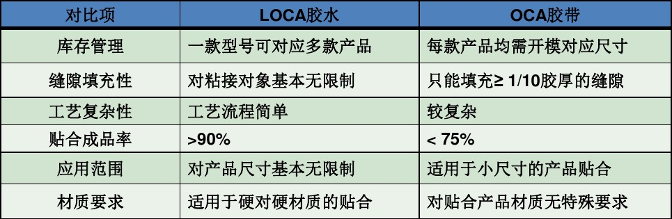 优点:可以粘接曲面或不平整表面材料,对油墨厚度不敏感,易返工,成本较OCA低。