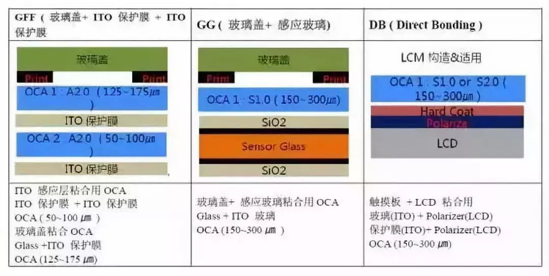手机屏幕的组成致3个部分分别为保护玻璃、触摸屏、显示屏。贴合的方式可以分为全贴合和框贴两种。全贴合OCA应用CTP结构:On/In cell、OGS、GF/GFF