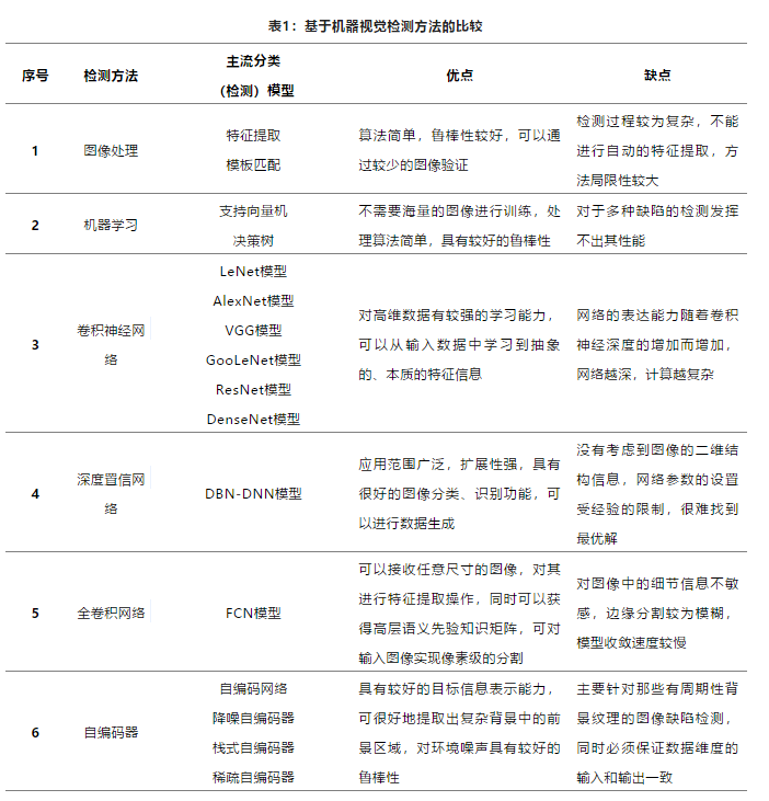 基于机器视觉的缺陷检测方法的比较如表1所示,包括各种方法的主流分类(检测)模型、优缺点对比。