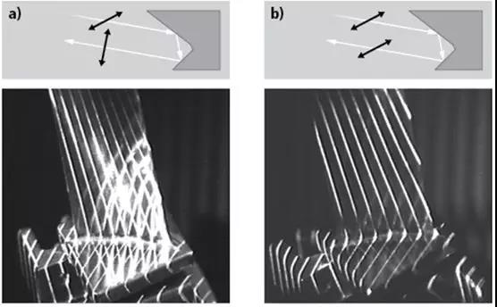 图4:闪光零件上的二次反射(a)。平行偏振光图像抑制额外反射(b)