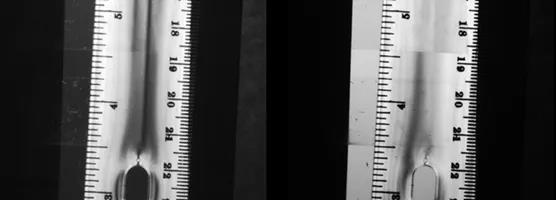 图8:左图显示了塑料尺中间的一条应力线;右图显示使用不同的偏振光后,由于厚度的变化,该应力线突然停止