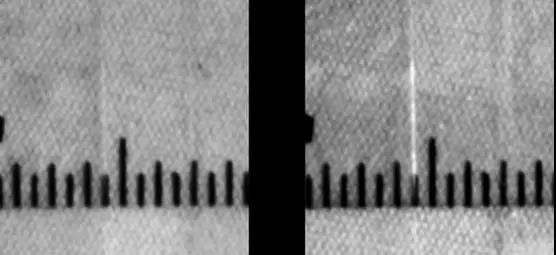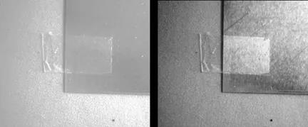 图5显示了金属表面上的一条透明胶带。左图显示的是低对比度的可见胶带,右图显示的是通过偏振使胶带更加突出。